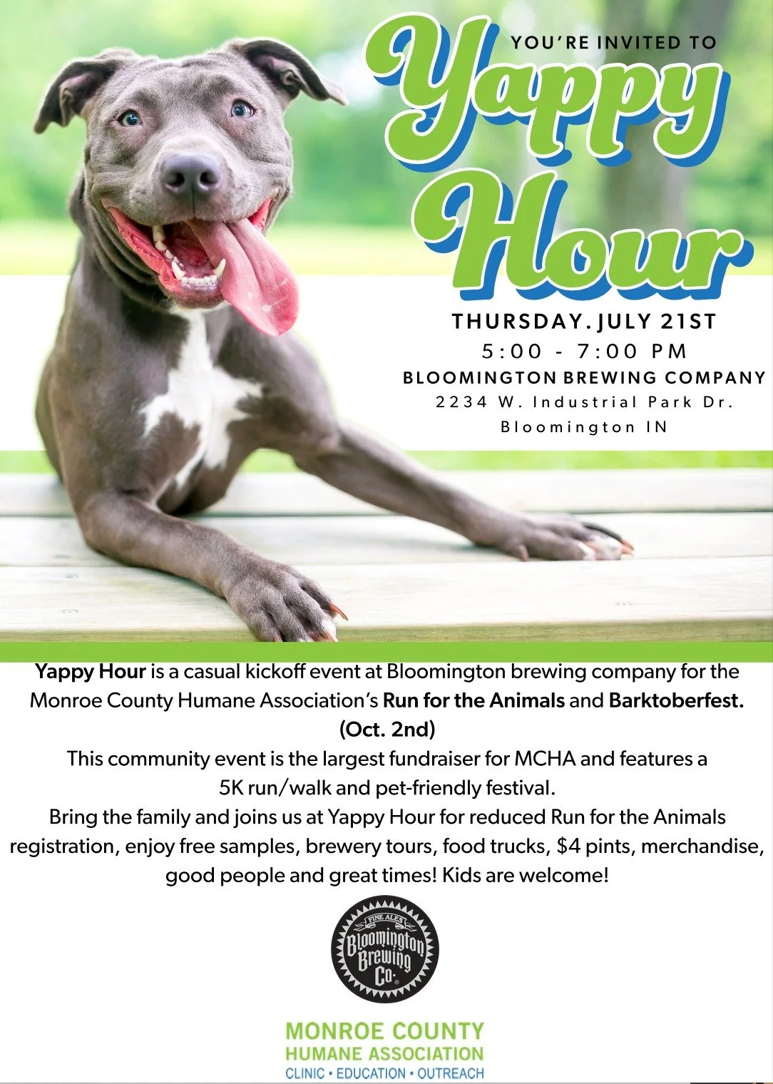 Join us July 21 from 5-8pm for another Thirsty Thursday at the brewery, featuring Pappy Shack food truck! As always, we'll have brewery tours, free samples, $4 pints, root beer floats for the kids, and merchandise sales! This month's Thirsty Thursday, we will be partnering with Monroe County Humane Association to kick off registration for their 5K Run for the Animals and Barktoberfest with Yappy Hour! They will be bringing MCHA pet therapy teams and offering discounted pricing for both human and pet registration.